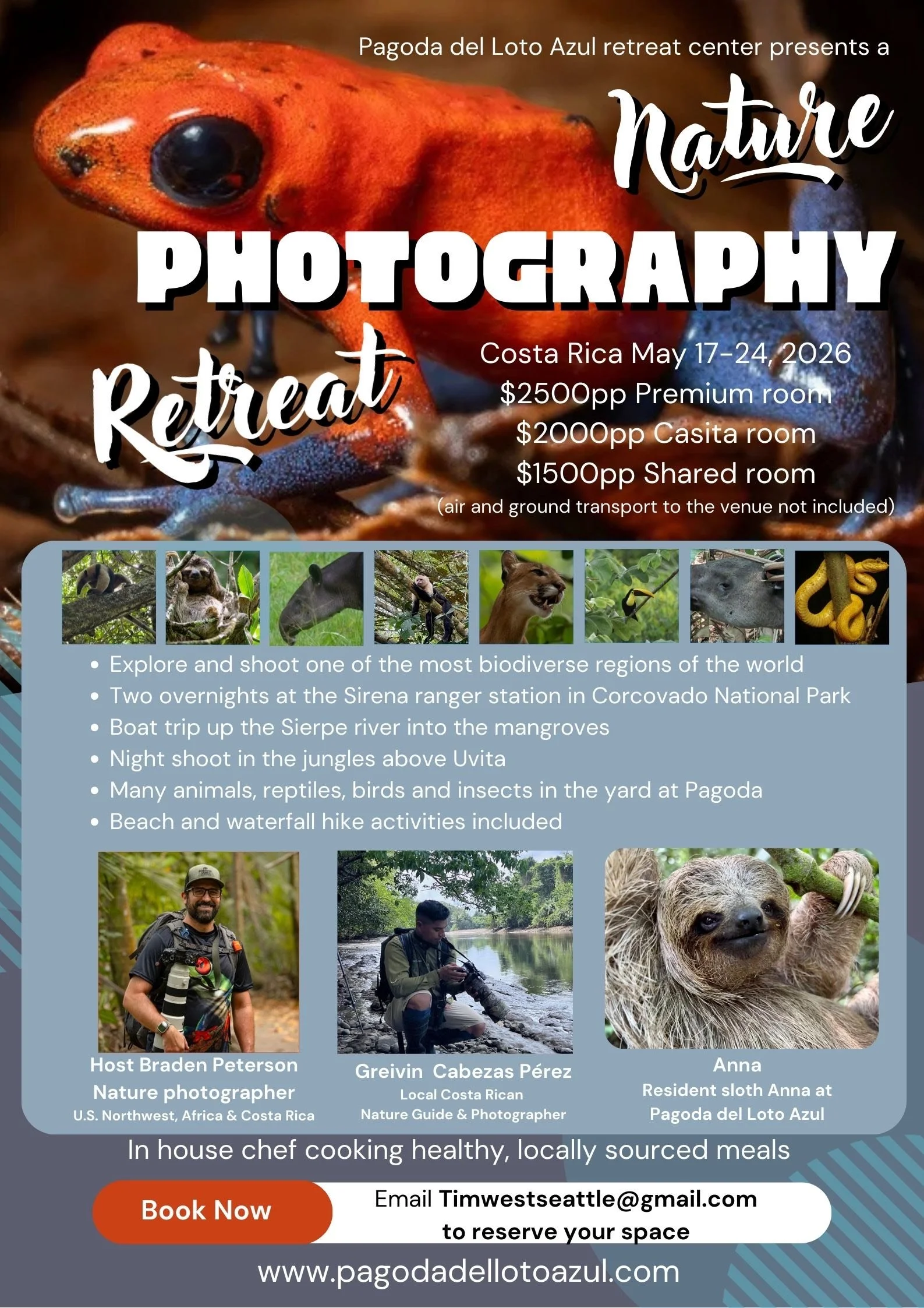 Day 2: Wake with the jungle and shoot around Pagoda with your coffee at sunrise. Two local tours for good birding and sloth sighting locations. Night tour and then dinner on the deck.